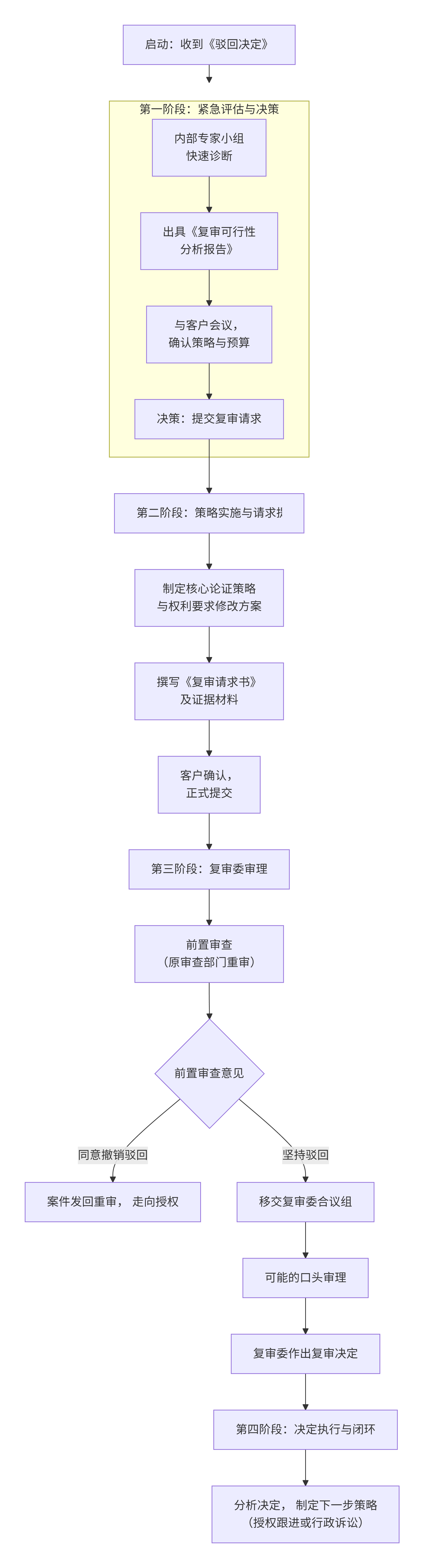 旨在为收到《驳回决定》的专利申请提供专业的法律救济代理服务。当专利申请在实质审查中被国家知识产权局驳回后,驳回复审是法定的、关键的救济程序。我们通过深度剖析驳回理由、重构法律与事实论证,向国家知识产权局复审和无效审理部(以下简称“复审委”)争取推翻原驳回决定,为申请赢得“重生”的机会。